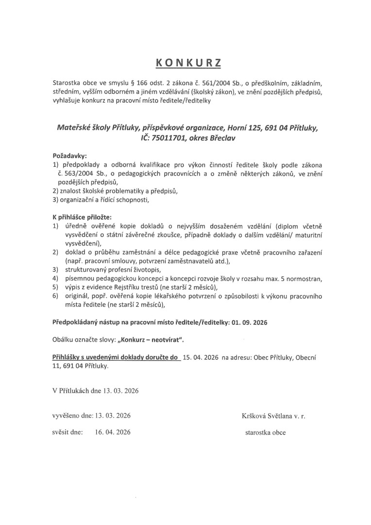 Konkurz na ředitelku MŠ Přítluky